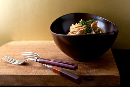 When the water comes to a boil, salt generously and add the spaghetti. Cook al dente, following the timing recommendations on the package but checking about a minute before the indicated time. When the pasta is almost done, add ¼ cup of the pasta water to the pan with the walnuts and anchovies, and reheat over medium heat.