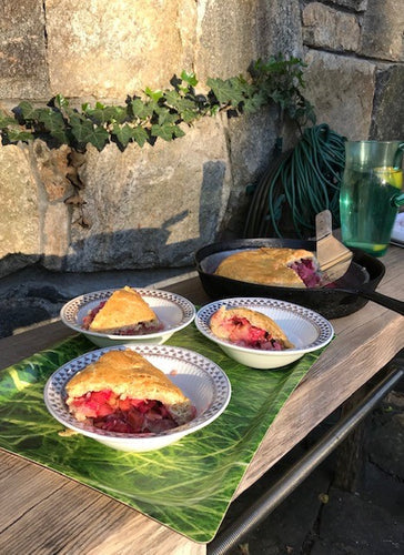 Cover the dough with the rhubarb and sprinkle the rhubarb with one cup of sugar (don't skimp). Place the second round on the top and pinch together the edges. Pinch together any holes. Beat the remaining egg w. one teaspoon water and brush it on the dough.