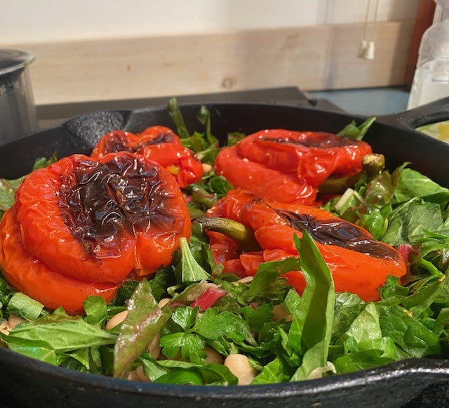 Pour the vinegar over the bean mixture. Eat the peppers and beans with more oil and vinegar to taste.