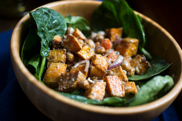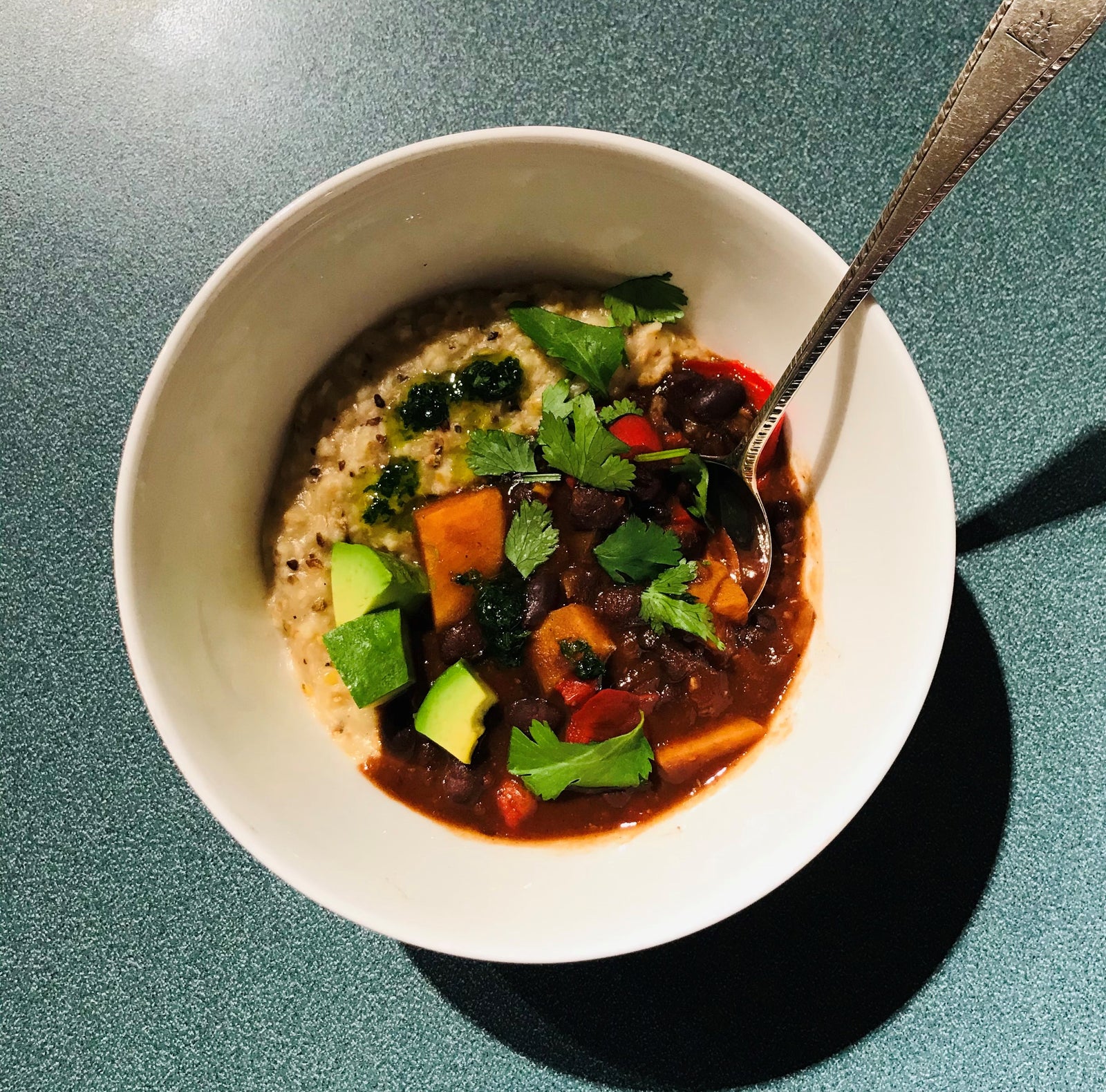 I usually think of chili only in the winter, but this vegetarian, sweet-potato chili is so light and delicious that it is a chili for all seasons. Beans, as you probably know by now, have a healthy balance of Omega-3s and Omega-6s, but I added flax meal to this recipe to balance out anything you may be serving alongside this chili: cornbread or mashed potatoes -- or, in my case, stone ground corn grits. I also cooked my beans from scratch (in a pressure cooker) but canned work well too. This recipe yields 6 bowls and is a surprisingly complex and tasty main that will satisfy vegetarians and omnivores alike.