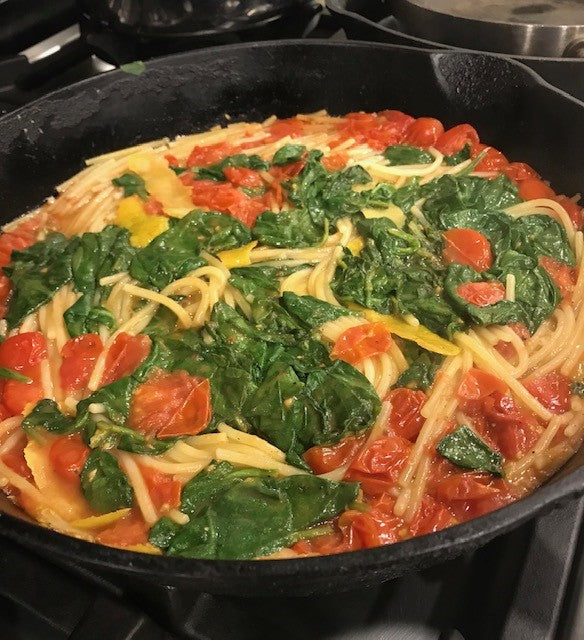 Like seven-minute risotto, one-pan spaghetti uses much less energy to prepare than classic two-pot recipes (one for the pasta and the other for the sauce). And the taste is in a different ball park. You have to try it to believe it. I couldn't wait to create variations, using sausage; olives; onions: and herbs.